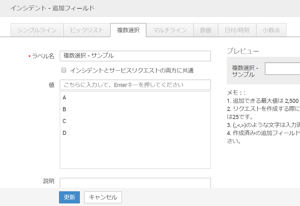 リクエストインポート時に「複数選択」タイプの追加フィールドに対して値をインポートする場合、