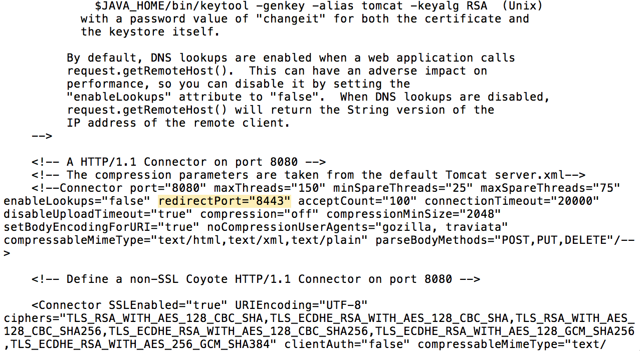 (リダイレクトポートの値を変更します。デフォルトでは、リダイレクトポートは8443に設定されており、必要に応じて別のポート番号を設定してください。) - 編集後、以下のように変更されていることを確認する