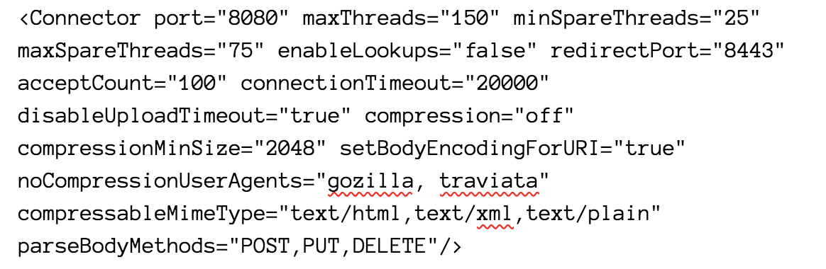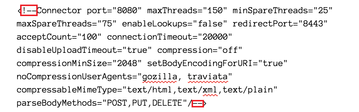 - 赤枠で囲まれたConnector port="8080" の前にある「!--」とparseBodyMethods="POST,PUT,DELETE"/の後にある「--」を削除する