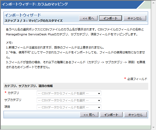 CSVファイルからインポートできるカテゴリ情報 作成日:2011年10月31日 | 更新日:2020年5月21日 機能と仕様 [管理タブ] > [ヘルプデスクのカスタマイズ] > [カテゴリ] > [CSVからインポート]でインポートできるカテゴリ情報の一覧は次の通りです。 このナレッジの総閲覧回数: 1,360 関連ナレッジ CSVファイルからインポートできるソフトウェアラインセンスフィールド ビルド9044における既知の問題とその回避策