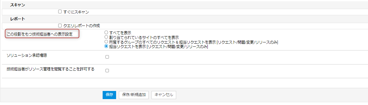 ※片方の役割全体が適用されるのではなく、項目ごとに権限が適用されます。 - 役割「この役割をもつ技術担当者への表示設定」については、
