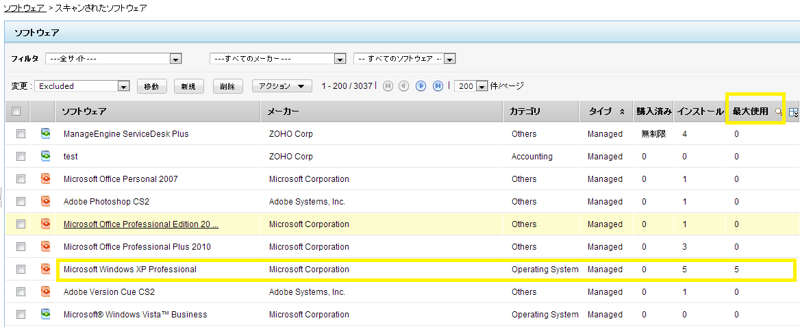 「スキャンされたソフトウェア」リストに表示される「最大使用」カラムについて