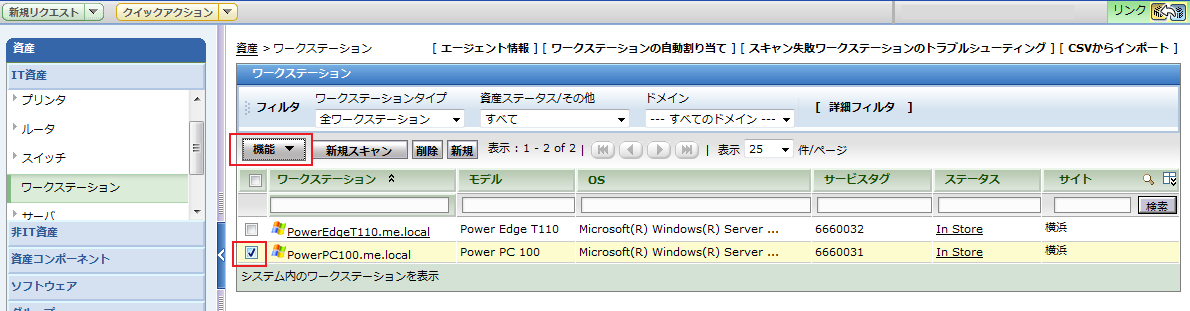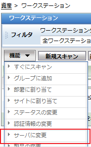 - リストビューに戻り、該当するサーバーのチェックボックスを有効にして、リスト左上の[機能]メニューをクリックします。