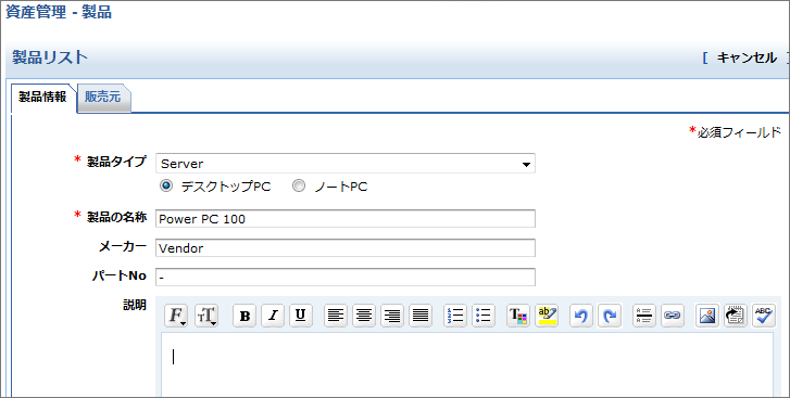 - [管理]タブ > [資産管理] > [製品]から、当該の資産の製品タイプが「Server」として