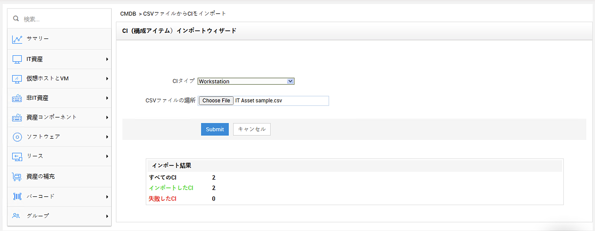 「CSVファイルの場所」にインポート対象のCSVファイルを指定します。「CI(構成アイテム)インポートウィザード」と表示されている場合、「CIタイプ」で「Workstation」を選択します。 - [Submit]ボタンをクリックします。