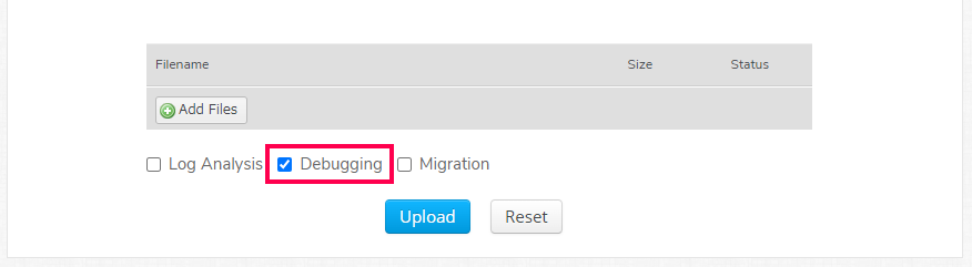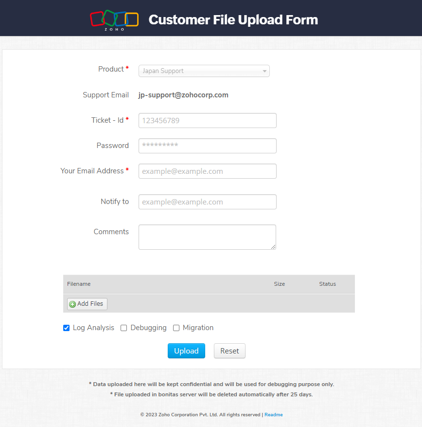 ログ、サポートファイル等の調査で使用するためのファイルをアップロード手順は以下の通りです。