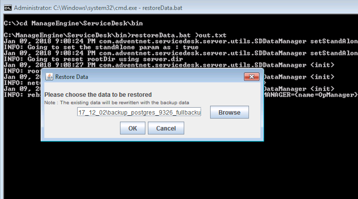 ※失敗した場合、restoreData.batを実行し、保守サポートに<インストールディレクトリ>ManageEngine/ServiceDesk/bin/フォルダーにある「out.txt」を送付してください。