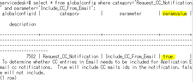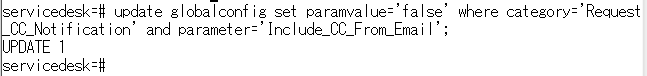 4. 念のため、クエリが正しく実行されたかどうか次のクエリを実行して確認します。(falseになっていることを確認ください)select * from globalconfig where category='Request_CC_Notification' and parameter='Include_CC_From_Email';