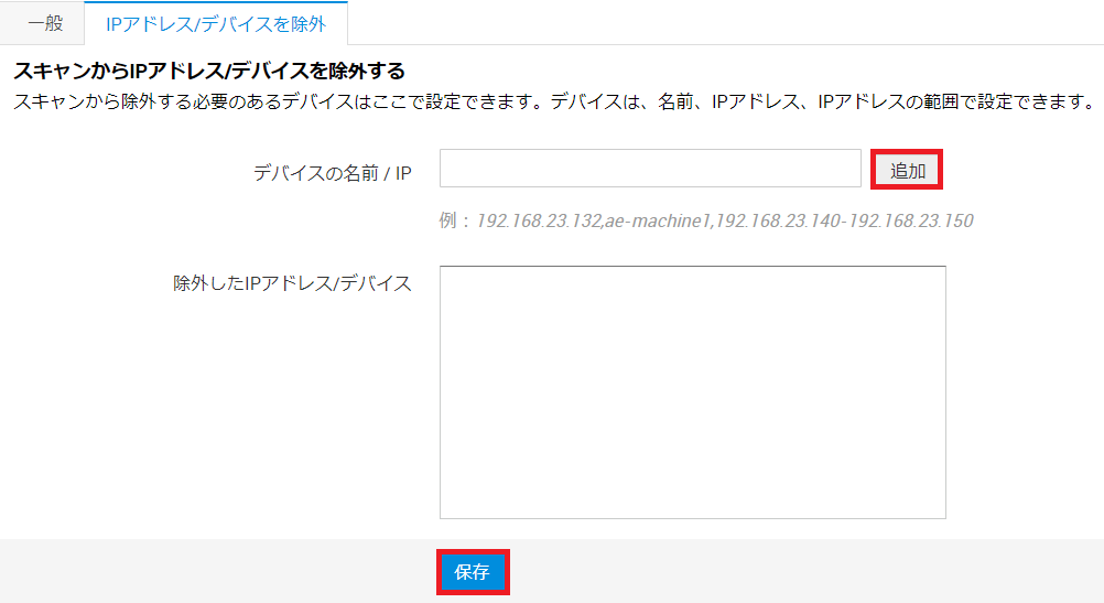 - 該当の「ホスト名」を[デバイスの名前/IP]に入力し、[追加]そして[保存]をクリックします。