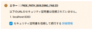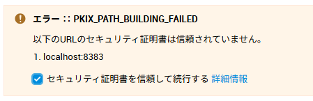 - Endpoint Centralはデフォルトで自己署名証明書を使用しています。自己署名証明書を使用する場合は[エラー::PKIX_PATH_BUILDING_FAILED]のエラーにおいて、「セキュリティ証明書を信頼して続行する」にチェックを入れます。