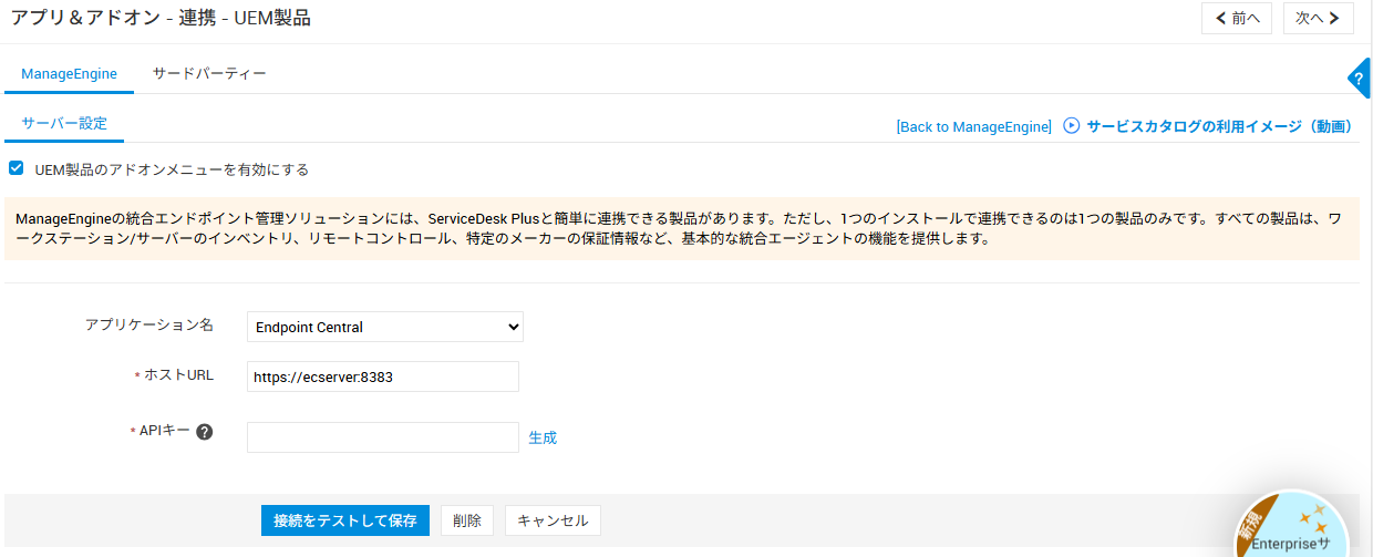 - [サーバー名/ポート番号]に、Endpoint Centralサーバーのホスト名とポート番号を入力し、連携に使用するプロトコル(HTTPS/HTTPS)を選択して、[APIキー]の[生成](既に連携済みで、変更する場合は[APIキー]→[APIキーを変更])をクリックします。