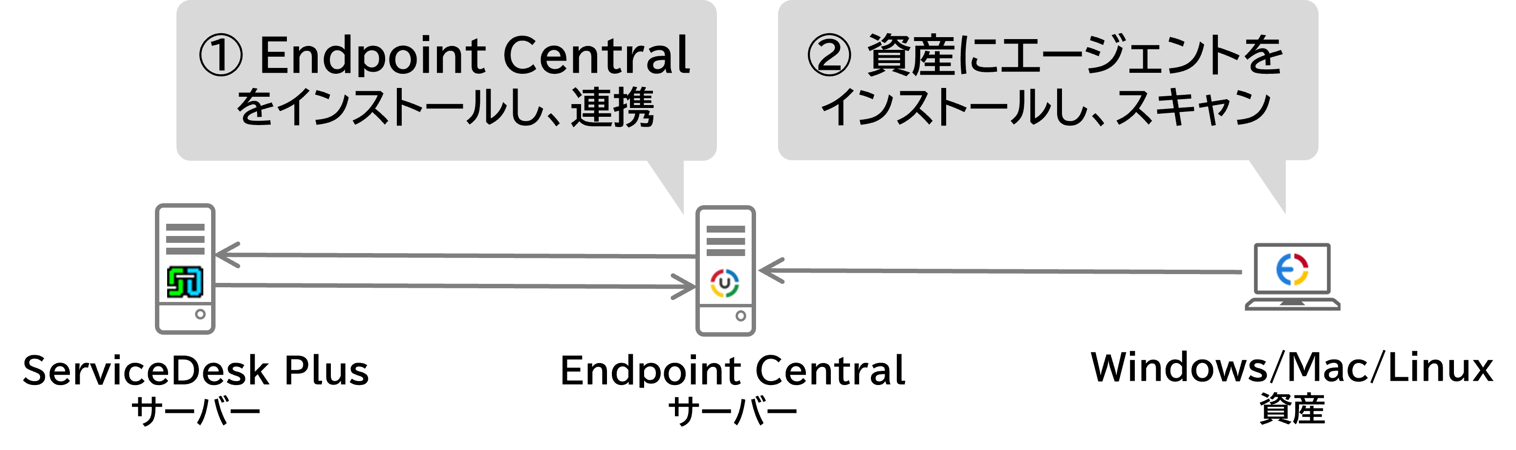 ※ServiceDesk Plusにおいて分散型スキャンを有効化している場合、各Asset ExplorerとEndpoint Centralを連携する必要があります。