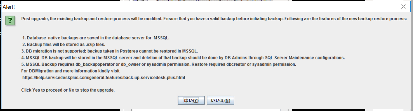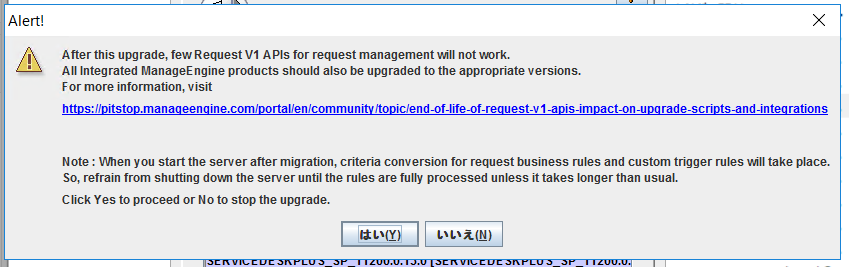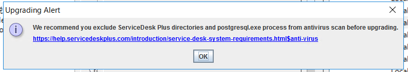 こちらのアラートは、アップグレード前にServiceDesk Plusのインストールディレクトリをアンチウイルススキャンから除外することを推奨する旨を示しています。詳細は、「システム要件」をご覧ください。