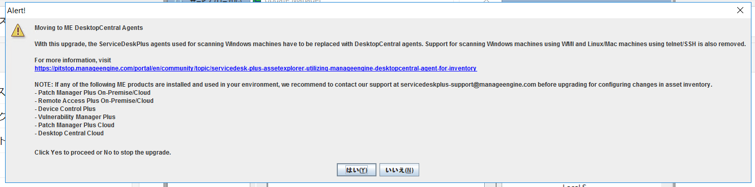 こちらのアラートは、ServiceDesk Plusの資産管理で、既存のエージェントのサポートを終了し、Endpoint Centralエージェントを使用する必要があることを示しています。詳細は「資産管理における仕様変更」をご覧ください。