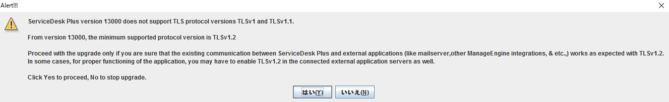 こちらのアラートは、TLSプロトコルにてバージョンV1およびV1.1のサポートが終了し、対応する最低のバージョンがV1.2になる旨を示しています。