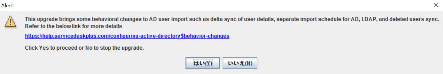 こちらのアラートは、アップグレードに伴い、ユーザーの詳細の差分同期、AD・LDAPの個別のインポートスケジュール、削除されたユーザーの同期などの、ADユーザーのインポートにいくつかの仕様変更が加えられる旨を示しています。詳細は、「Active Directoryの設定」をご覧ください。