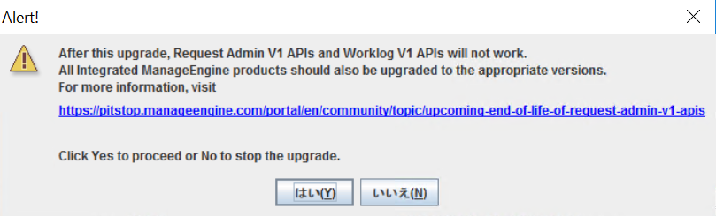 こちらのアラートは、リクエストのAdmin API V1およびWorklogのAPI V1のサポートが終了すること、また、連携しているすべてのManageEngine製品も適切なバージョンにアップグレードする必要がある旨を示しています。詳細は、「リクエストのAdmin API V3について」をご覧ください。