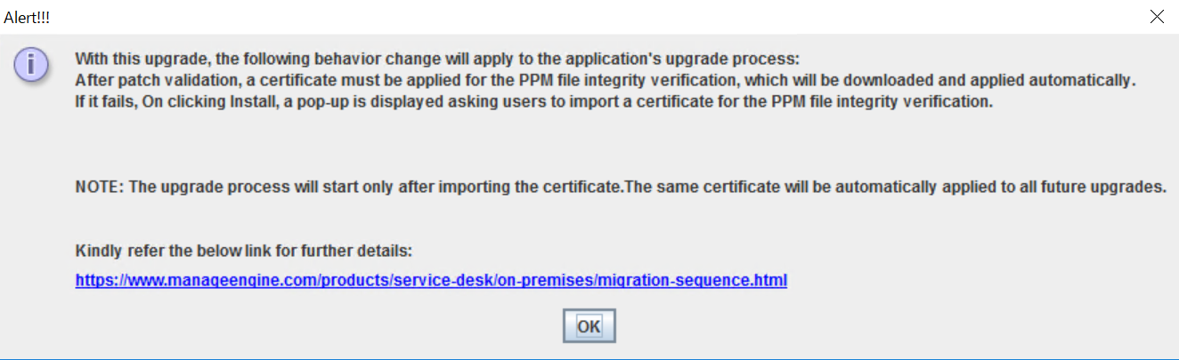 こちらのアラートは、パッチ検証後に、PPMファイルの整合性チェックのための証明書を適用する必要がある旨を示しています。なお、その証明書は自動的にダウンロード・適用されます。