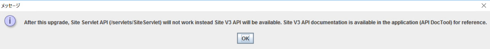 こちらのアラートは、サーブレットAPI(/servlets/Site Servlet)のサポートが終了し、代わりにAPI V3が利用できること、およびAPI V3のドキュメントがServiceDesk Plus内から参照可能になる旨を示しています。