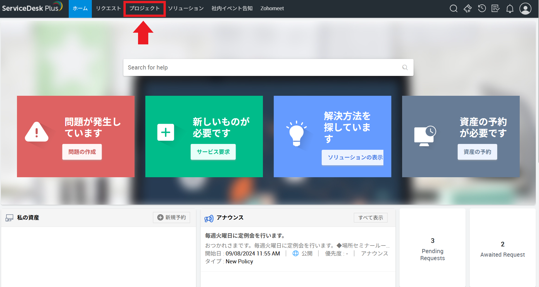 依頼者のセルフサービスポータルに[プロジェクト]タブが表示されている例: