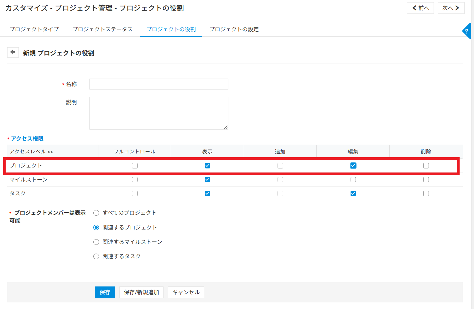 「閲覧権限」のみや、「プロジェクトのタスクのみの編集権限」等、プロジェクト内でのアクセス権限を新規に作成します。