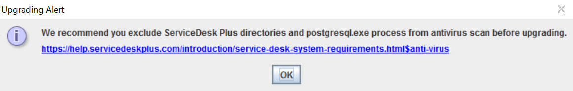 こちらのアラートは、アップグレード前にServiceDesk Plusのインストールディレクトリをアンチウイルススキャンから除外することを推奨する旨を示しています。詳細は、「システム要件」をご覧ください。