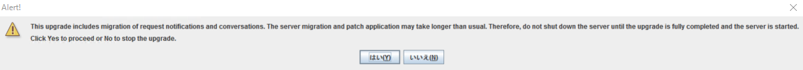 こちらのアラートは、本アップグレードにリクエストの通知と会話における移行が含まれており、サーバー移行とパッチの適用が通常よりも時間がかかる可能性がある旨を示しています。