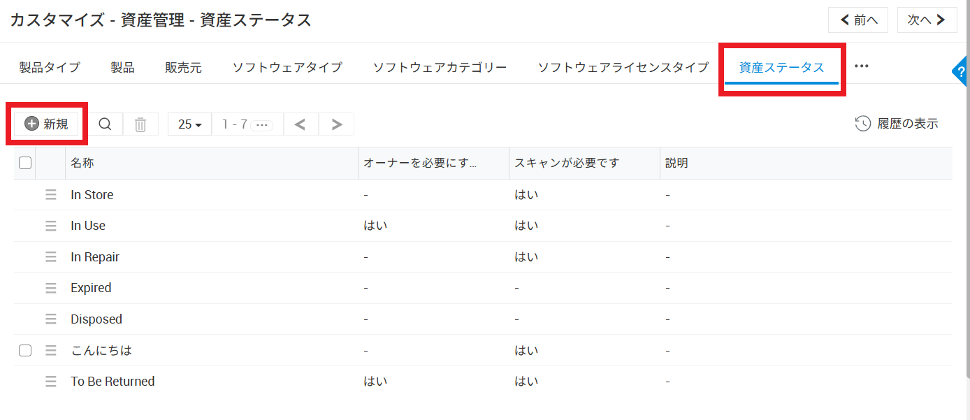 - 左上の[新規]ボタンから、日本語で資産ステータスを新規作成します。