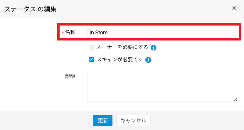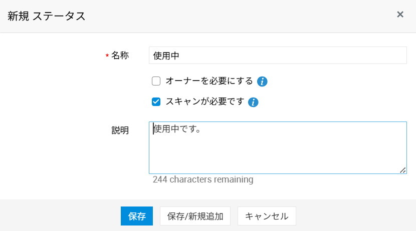 資産ステータスを英語ではなく日本語で新規作成した場合も、「オーナーを必要にする」「スキャンが必要です」といったオプションを問題なく有効化/無効化できます。