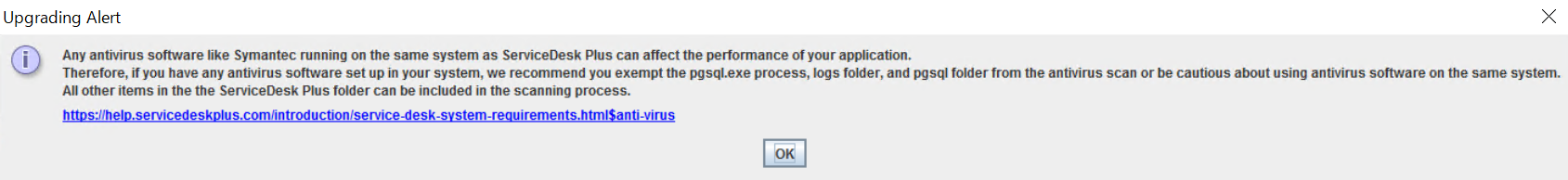 こちらのアラートは、ServiceDesk Plusが起動しているシステム内のSymantecなどのアンチウイルスソフトウェアが、アプリケーションのパフォーマンスに影響を及ぼす可能性があることを示しています。