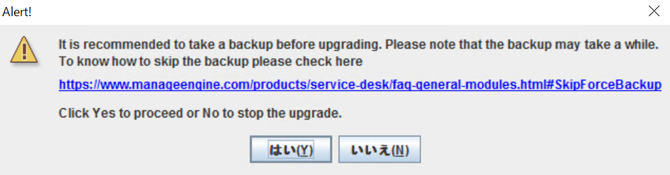 こちらのアラートは、アップグレード前にバックアップを取得することを推奨する旨を示しています。