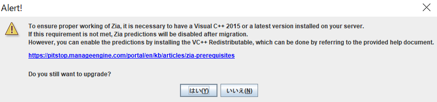 こちらのアラートは、Ziaの動作を保証するために、サーバーにVisual C++ 2015またはそれ以降のバージョンをインストールしている必要がある旨を示しています。