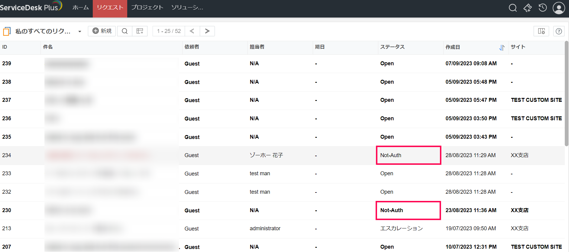 依頼者ログイン時のリクエスト一覧ページで、設定した覚えのない値「Not-Auth」と表示されているフィールドがありました。