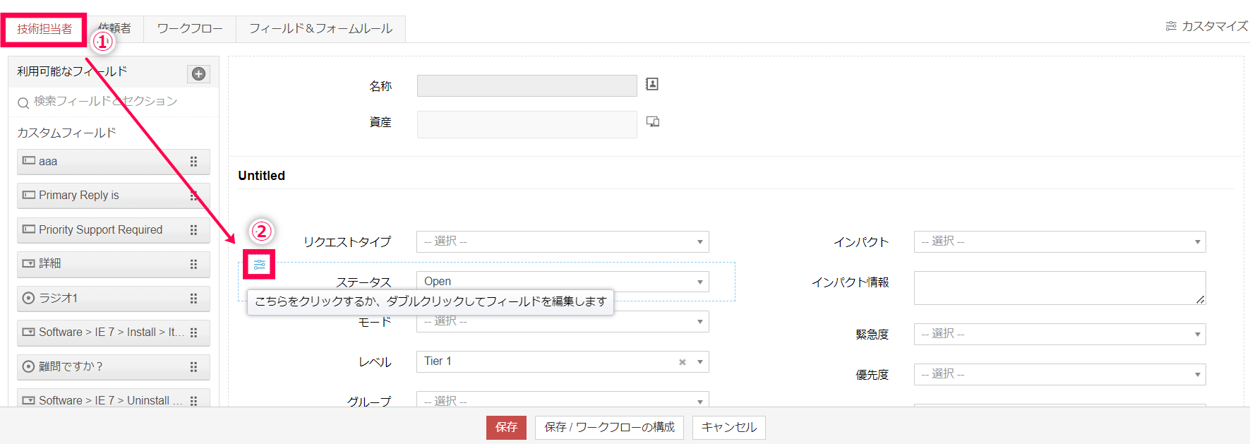 「プロパティ」セクションで確認できます。 - [技術担当者(①)]タブを開き、[プロパティ(②)]アイコンをクリックして、