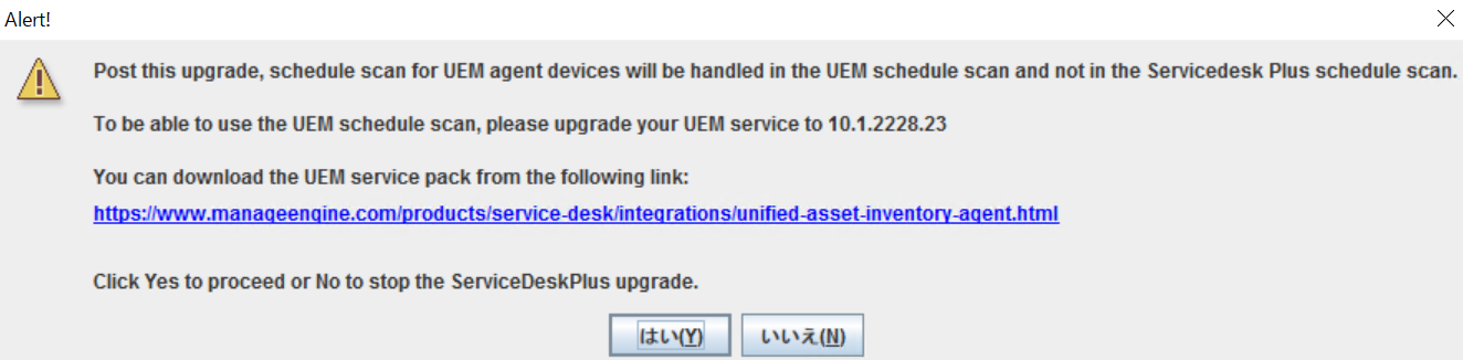 こちらのアラートは、アップグレード後、UEM(Endpoint Central)エージェントデバイスのスケジュールスキャンが、