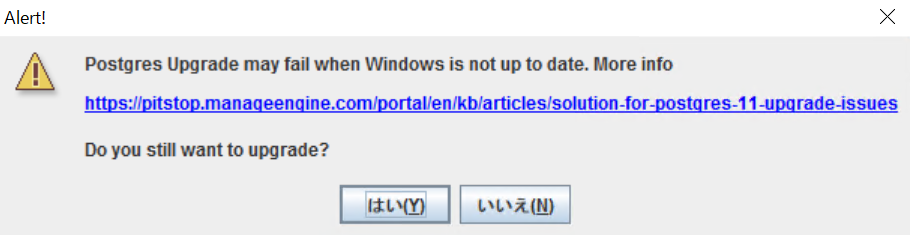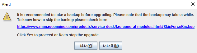 つまり、上記アラートは、ServiceDesk Plusのアップグレードを実施する前に、