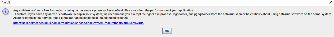 こちらのアラートは、ServiceDesk Plusが起動しているシステム内のSymantecなどのアンチウイルスソフトウェアが、