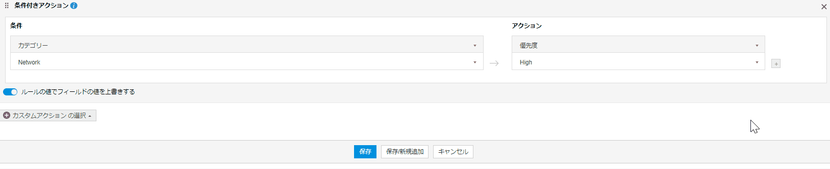 カテゴリー(条件フィールド)を基に、優先度や緊急度、インパクト(アクションフィールド)を「High」や「Normal」とそれぞれ自動的に決定できるように設定します。