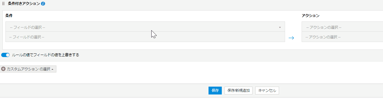 条件フィールドにマウスのカーソルを合わせた際に表示される[+ / -]ボタンで、基準となるフィールドを追加/削除できます。 - アクションフィールドの設定