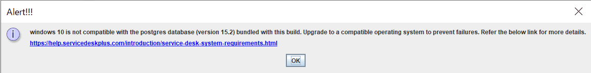 PostgreSQLデータベースの互換性に伴い、サーバーのOSがシステム要件を満たす必要がある旨を示しているエラーとなります。